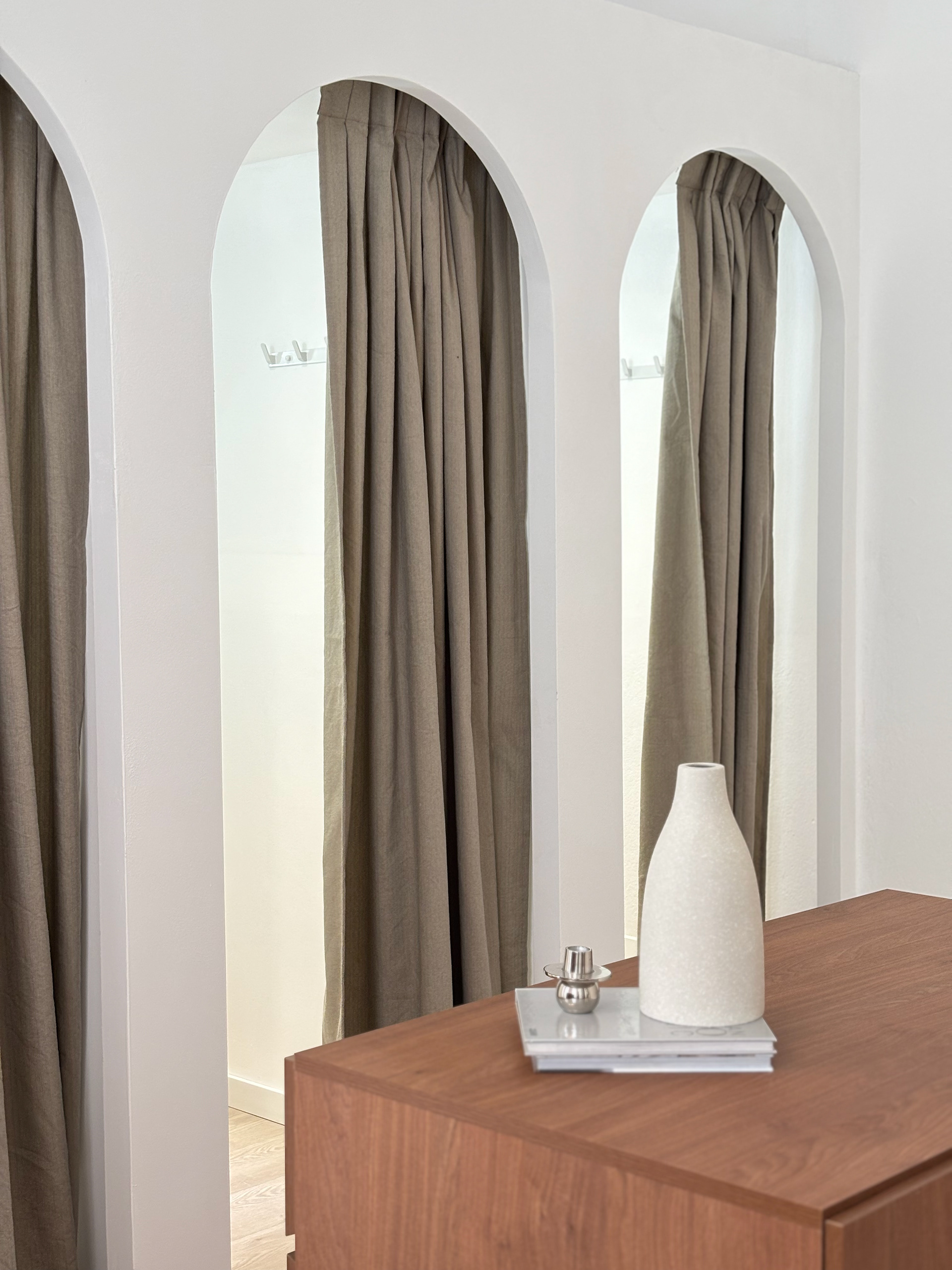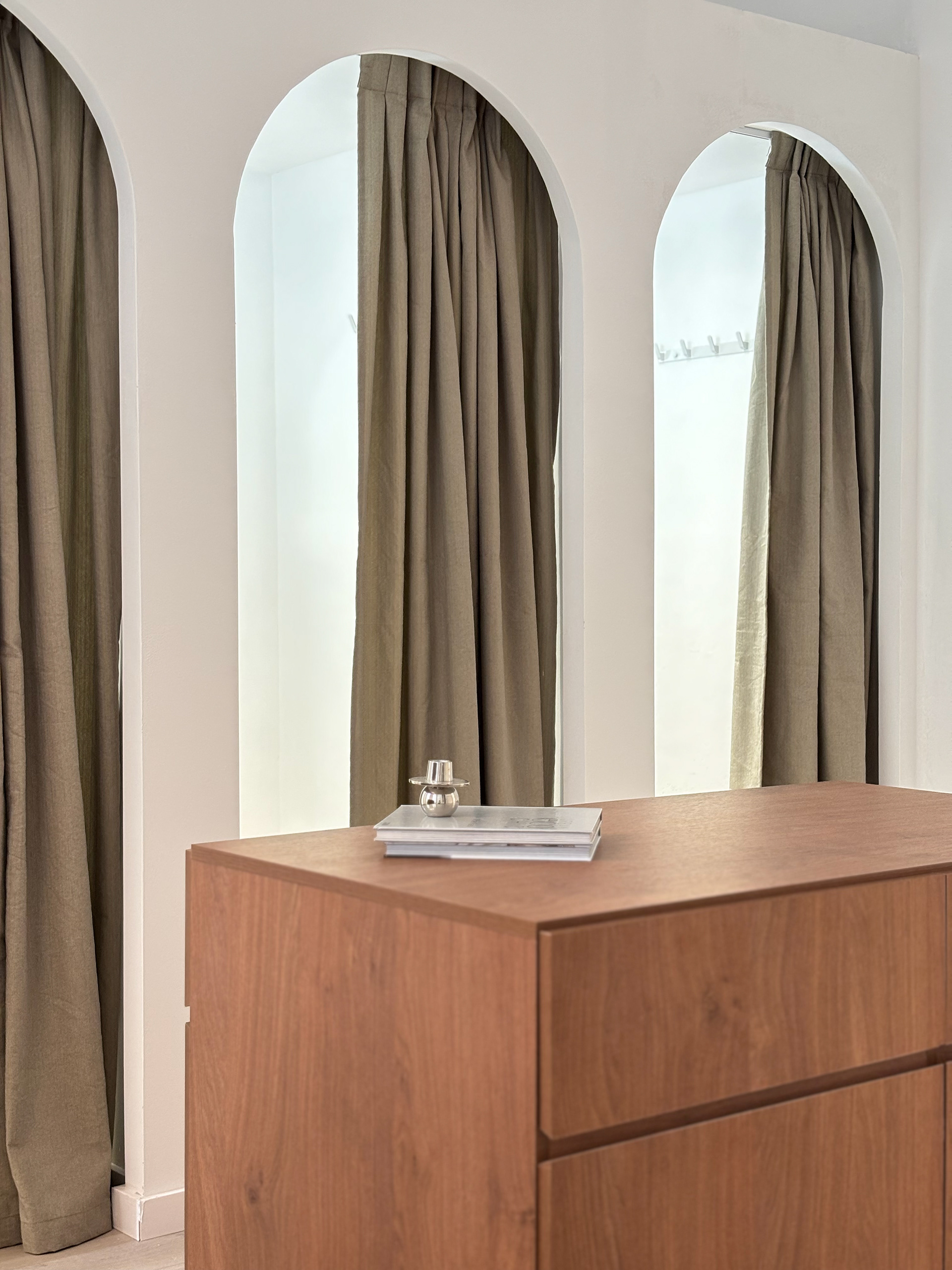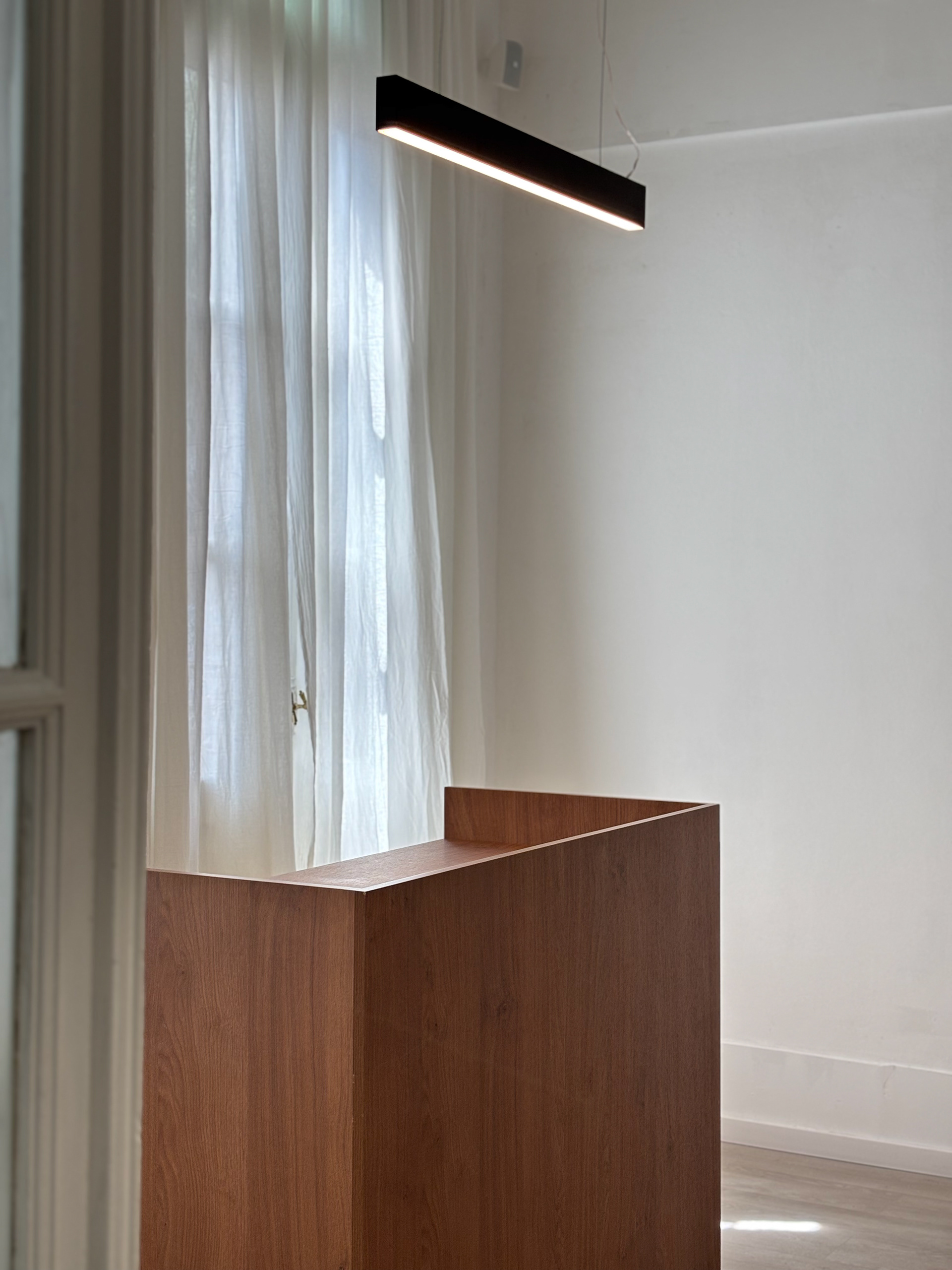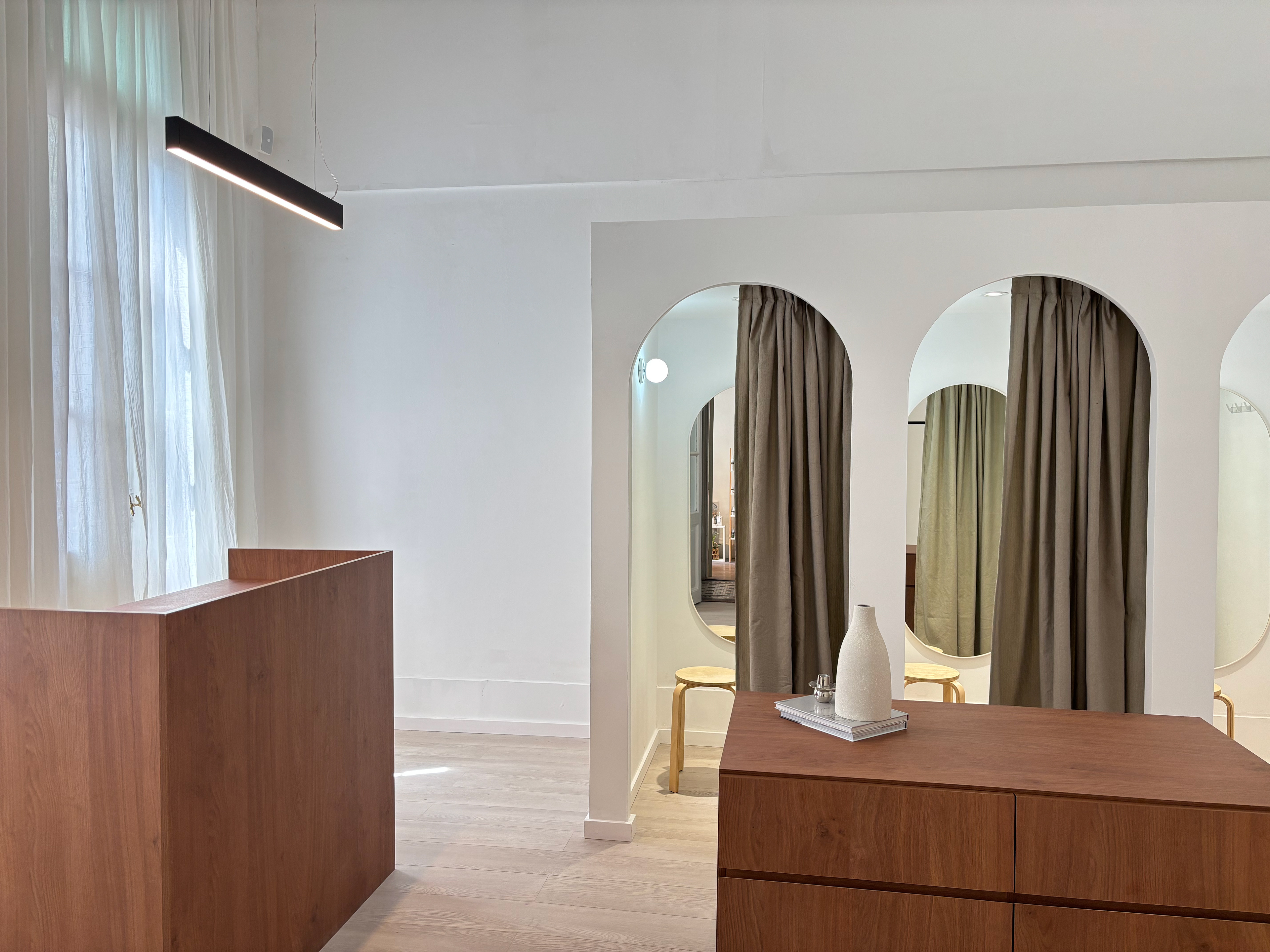 Realizamos el interiorismo y la remodelación integral de un showroom de ropa en Rosario, ubicado en una casona antigua con una impronta única. Aprovechamos la gran altura del espacio para diseñar una “caja” protagonista, enmarcada con cortinas de tusor blanco que aportan suavidad y movimiento, acompañada por una lámpara de líneas simples que refuerza la calma y la elegancia del conjunto.