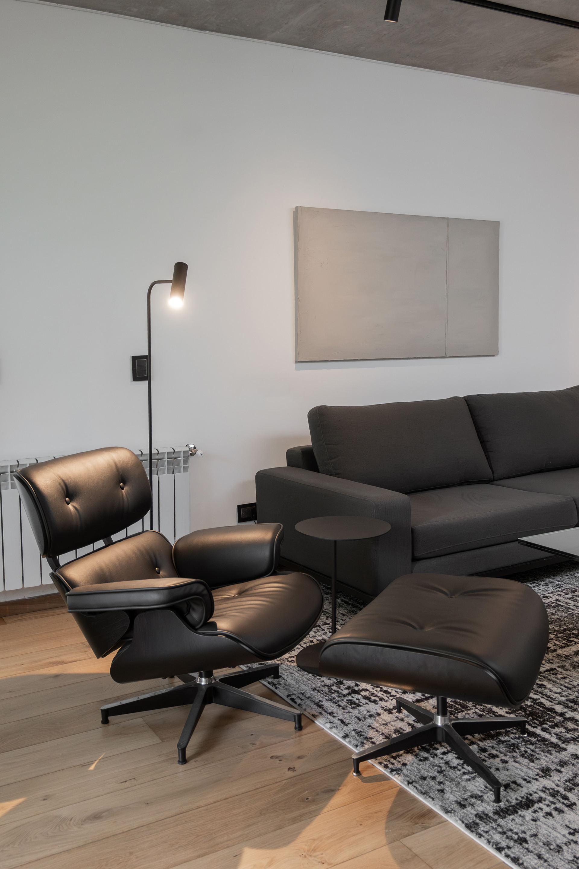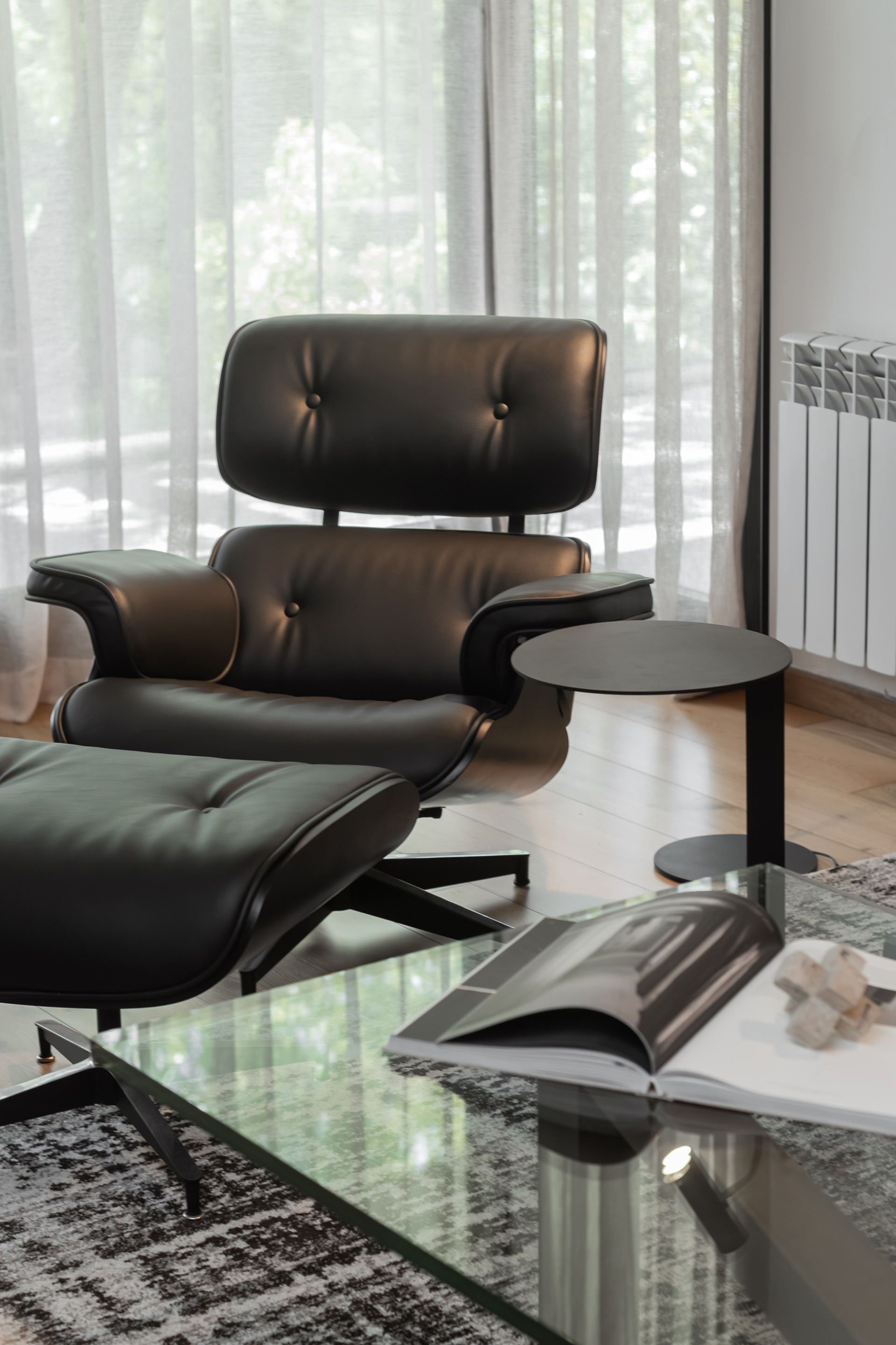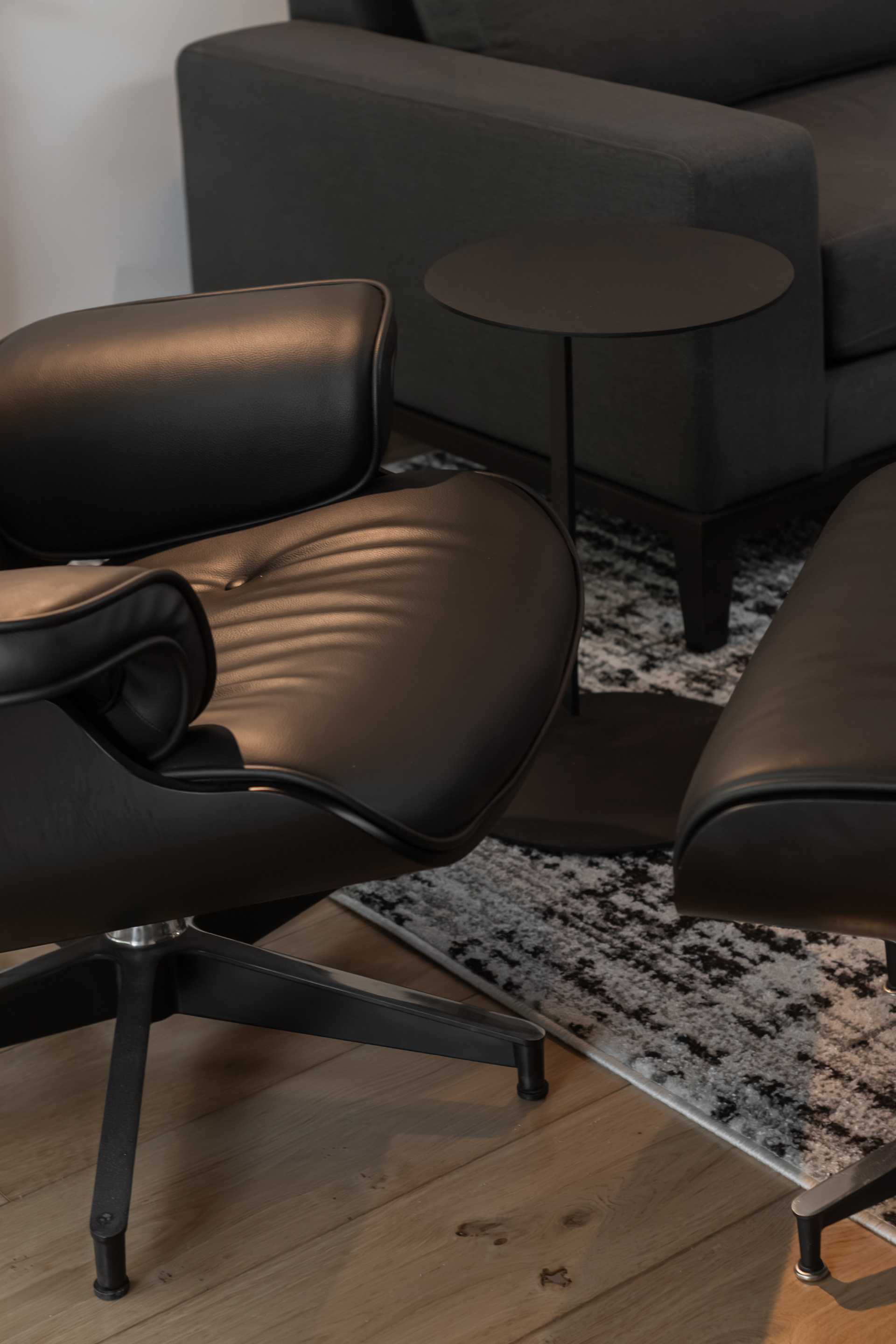 Para el rincón de lectura elegimos el butacón Eames Miller, una pieza cómoda y envolvente que aporta diseño, elegancia y modernidad. Lo acompaña una lámpara de pie de líneas limpias, que suma calidez y acento visual sin restar protagonismo.