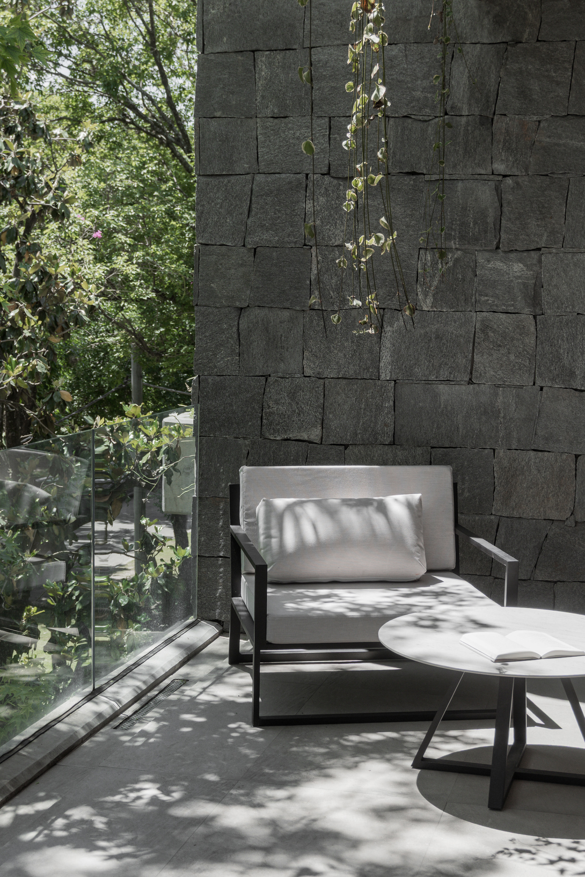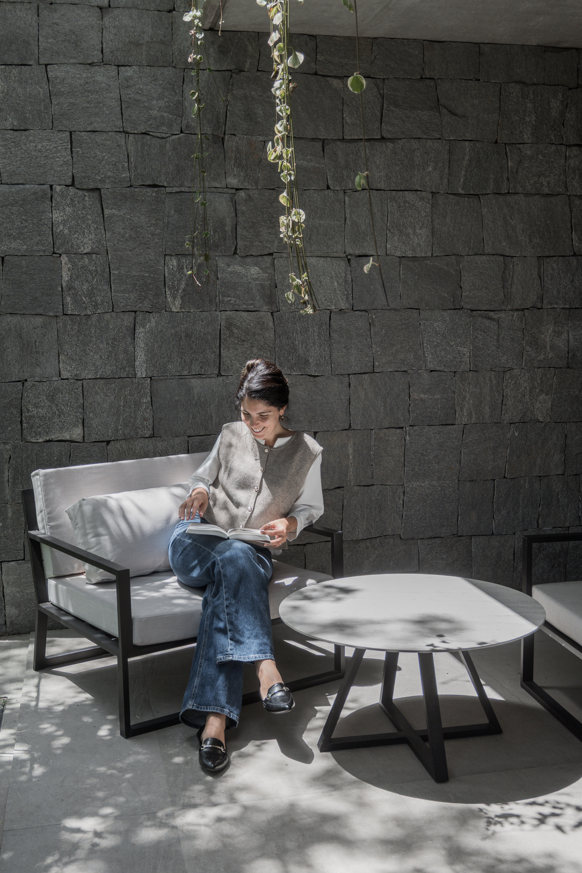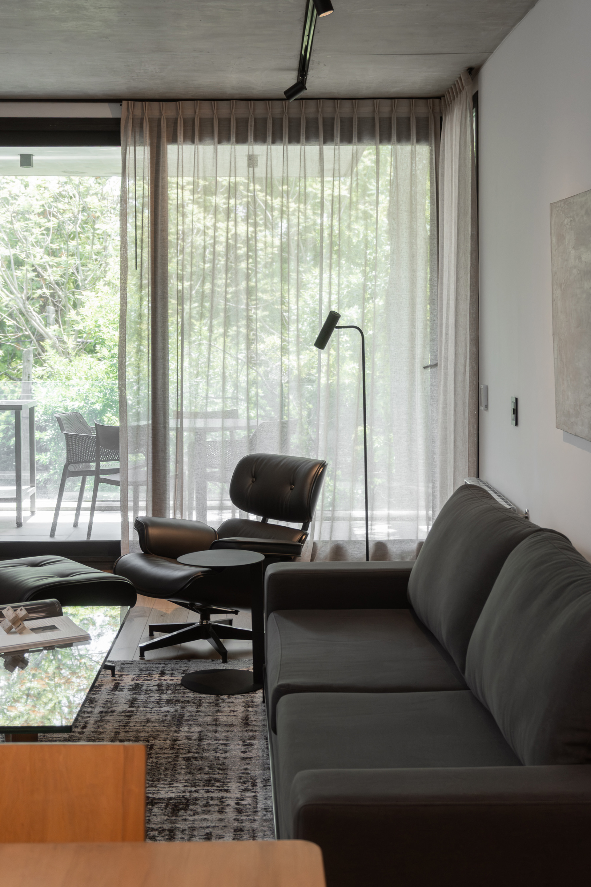 Para este balcón seleccionamos un juego de living con tapizado en tela náutica, resistente al exterior, acompañado por una mesa de Dekton con acabado marmóreo en tonos neutros. La calidez de la luz solar y el juego de sombras terminan de coronar este espacio, aportando una atmósfera serena y acogedora.